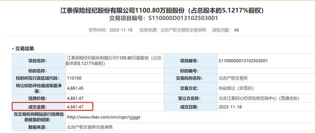 不过,当财联社记者查阅北京市公共资源交易服务平台发现,有关于江泰保险经纪1100.80万股股份(占总���本的5.1217%)的项目在2023年11月16日已成交,成交价格为4,861.47万元,折合每股约4.42元。同时,记者还在发现,中煤集团曾于2023年8月9日在该平台挂牌该股权,挂牌价格正是4861.47万元。