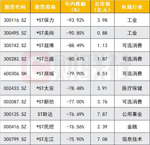 值得注意的是,在众多题材板块中,ST板块今年以来表现最为低迷。在资本市场新“国九条”出台后的首个交易日,A股ST板块出现批量跌停。据统计,截至5月15日,ST板块年内累计下跌38.78%,在Wind热门概念指数中跌幅居首。54只ST股累计下跌超50%,其中*ST越博、*ST美尚、*ST三盛累计跌幅均超80%,三者A股市值均不足2亿元。