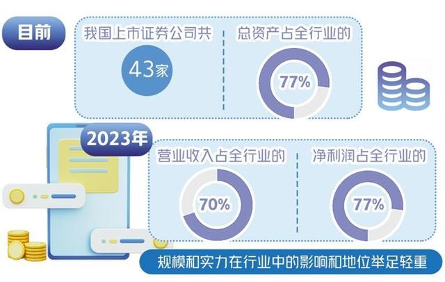 “目前,我国上市证券公司共43家,总资产占全行业的77%,2023年的营业收入、净利润分别占全行业的70%和77%,规模和实力在行业中的影响和地位举足轻重。”证监会证券基金机构监管司司长申兵表示,从近年来的监管实践看,上市证券公司仍面临“大而不强”的问题,在发展理念、投资者保护、内控治理、信息披露等方面距离一流投资银行和投资机构的标准和要求仍有较大差距。