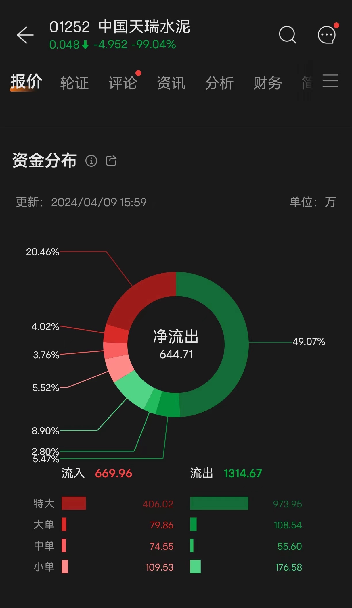 这个跌幅意味着什么?可做个简单比较,即以当前现价购入一手中国天瑞水泥需48港元,港股手续费甚至要高于一手的价格。此外,还有网友表示,如果有人午休后买入一百万港元的中国天瑞水泥,收市后市值就只剩9600港元,跌幅刺激程度堪比币圈。