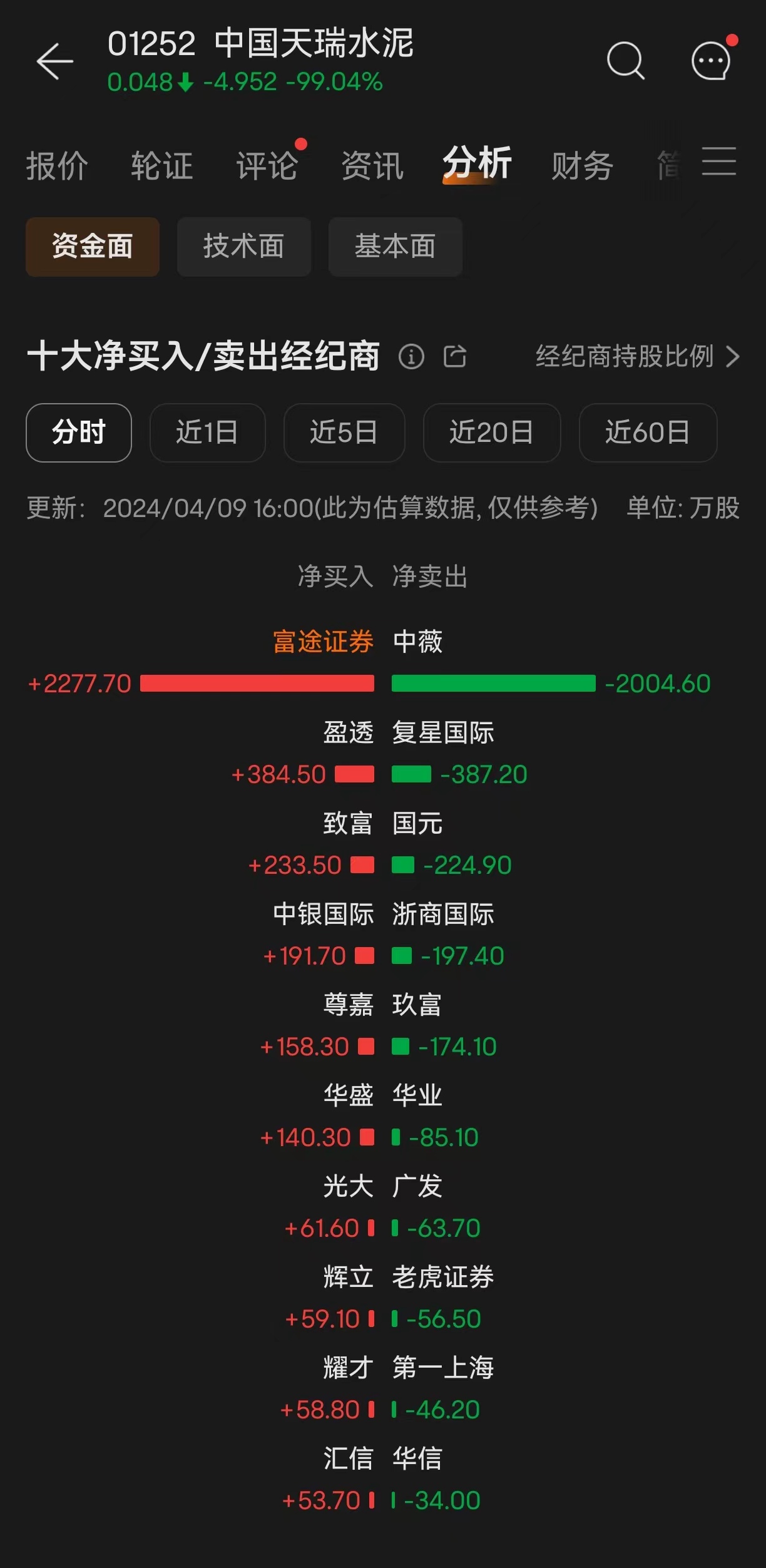 资金分布方面,据富途证券数据,截至今日15:59,天瑞水泥净流出1314.67万港元,净流入669.96港元。而今日净买入和净卖出经纪商排名上,富途证券净买入第一,达2277.7万股,中薇证券净卖出第一,卖出2004.6万股。