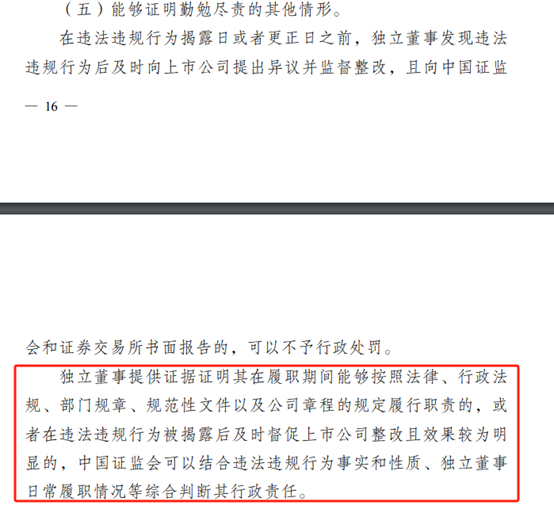 去年9月,证监会发布的《上市公司独立董事管理办法》正式施行。其中,第四十六条规定了独立董事免于行政处罚的多种情形,在该条目第五款“能够证明勤勉尽责的其他情形”中,即明确:在违法违规行为揭露日或者更正日之前,独立董事发现违法违规行为后及时向上市公司提出异议并监督整改,且向中国证监会和证券交易所书面报告的,可以不予行政处罚。独立董事提供证据证明其在履职期间能够按照法律、行政法规、部门规章、规范性文件以及公司章程的规定履行职责的,或者在违法违规行为被揭露后及时督促上市公司整改且效果较为明显的,中国证监会可以结合违法违规行为事实和性质、独立董事日常履职情况等综合判断其行政责任。