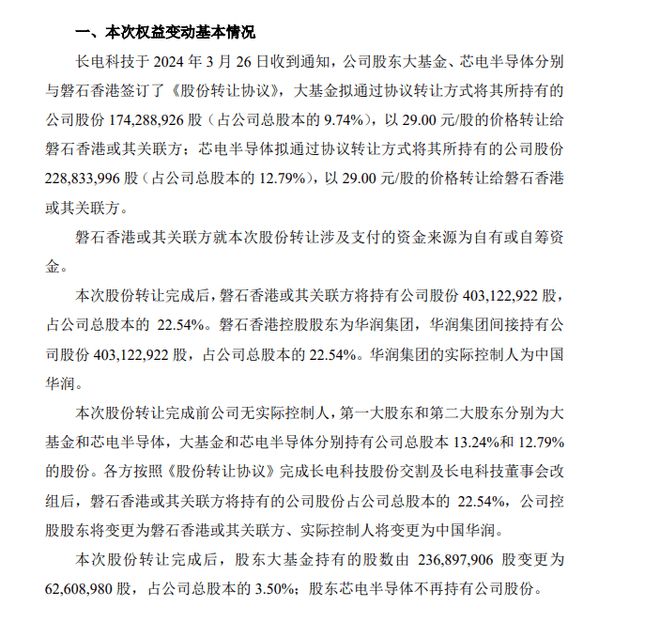 2月26日,长电科技公告,公司股东大基金、芯电半导体分别与磐石香港签订了《股份转让协议》,大基金拟通过协议转让方式将其所持有的公司股份174,288,926股(占公司总股本的9.74%),以29.00元/股的价格转让给磐石香港或其关联方;芯电半导体拟通过协议转让方式将其所持有的公司股份228,833,996股(占公司总股本的12.79%),以29.00元/股的价格转让给磐石香港或其关联方。公司股票将于2024年3月27日(星期三)上午开市起复牌。