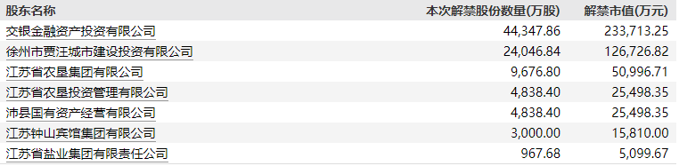 此次解禁的股东共七位,包括交银金融资产投资有限公司等,多为江苏地区国资背景企业。