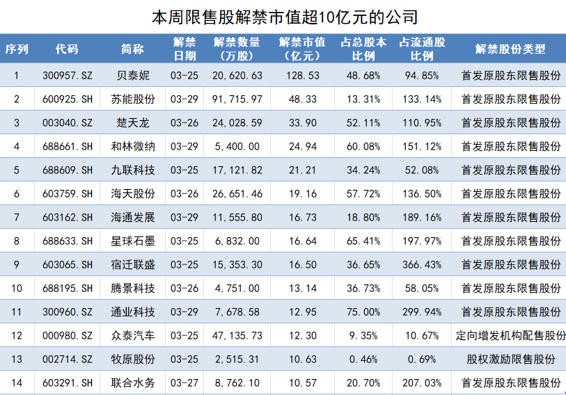 其中,解禁市值超过10亿元的公司有14家,贝泰妮(300957.SZ)是本周唯一一家解禁市值超过100亿元的公司,苏能股份(600925.SH)、楚天龙(003040.SZ)紧随其后,解禁市值均超过30亿元。
