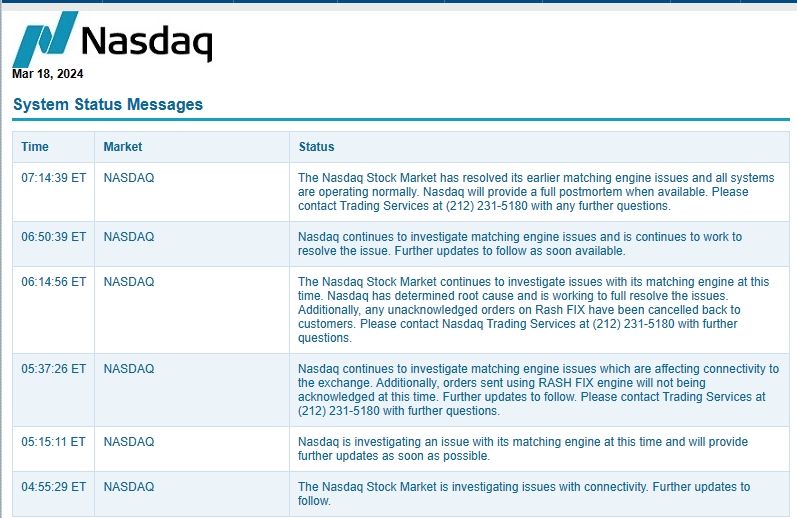 当地时间周一,纳斯达克股份有限公司表示,因技术故障,其交易所的盘前交易一度中断超过两个小时,目前所有系统已恢复正常运行。