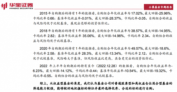 2023年1月,华宝证券曾以万得普通股票型基金指数、万得偏股混合型基金指数作为主动权益基金代表,测算2015年、2018年底、2020年、2022年基金公司自购潮的基金收益情况: