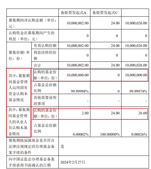 不仅如此,2024年1月18日,新成立的万家锦利债券发起式基金,募集金额1000.0073万元,4户认购者中,管理人万家基金认购1000万元,员工认购14元,剩下的59元来自外部认购。