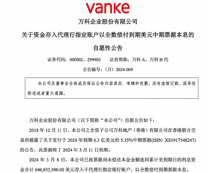 3月8日晚间,万科针对3月11日到期的美元债发布了一则自愿性公告称,为确保全额偿还到期票据本息,公司已在到期前提前将本金及累计至到期日的利息共计约6.47亿美元存入代理行指定银行账户。