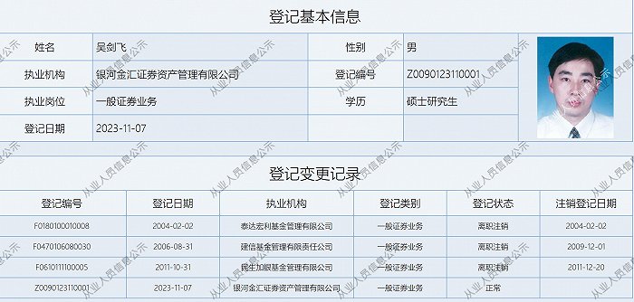 据银河金汇披露,吴剑飞在此次就任银河金汇董事长前,已于2023年12月加入银河金汇,担任公司执行委员会主任,兼任党总支书记。中国证券业协会显示,其本人加入银河金汇时间为2023年11月。