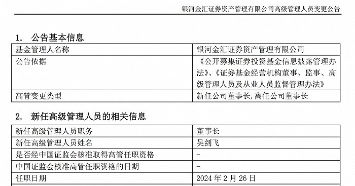 2024年2月28日,银河金汇证券资产管理有限公司(下称:银河金汇)发布高管变动,吴剑飞获委任为公司新任董事长,任职自2024年2月26日起。公司前任董事长刘冰因工作变动于同日离任。