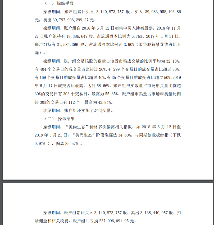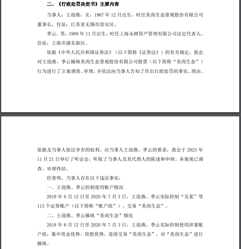 中国证监会近日出具的《行政处罚决定书》显示,时任美尚生态董事长王迎燕联合上海永树资产管理有限公司法定代表人季云,操纵美尚生态股票。2018年6月12日至2020年7月3日,王迎燕、季云实际控制使用涉案账户组,集中资金优势、持股优势,连续交易“美尚生态”,对“美尚生态”进行操纵。