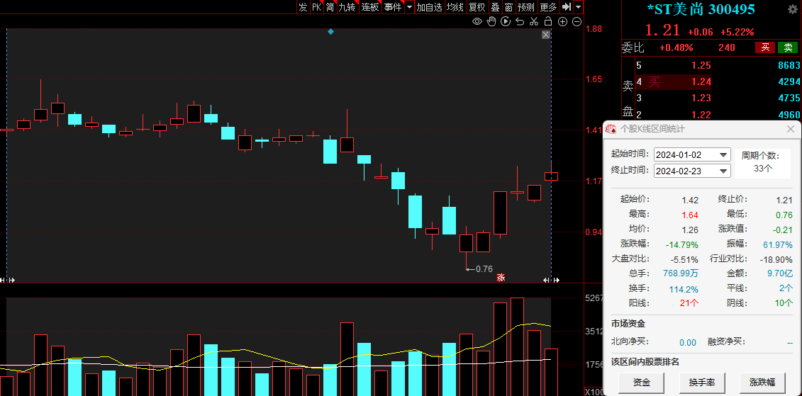 股价表现上,截至2月23日午间收盘,*ST美尚上涨5.22%,股价报收1.21元,年内跌幅达14.79%,最新总市值仅8.16亿元。