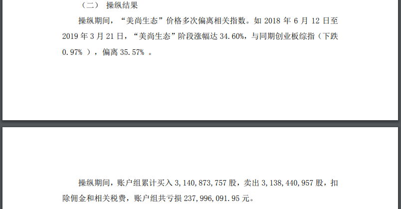 从操纵结果来看,操纵期间,“美尚生态”价格多次偏离相关指数。如2018年6月12日至2019年3月21日,“美尚生态”阶段涨幅达34.60%,与同期创业板综指(下跌0.97%)偏离35.57%。