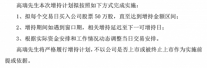 而这一次的增持计划,高瑞表示是认为公司股票具备投资价值,可以通过购买公司股票获得公司发展后股东价值、股票增值,且有利于促进公司价值回归。且本次增持不谋求上市公司控制权。