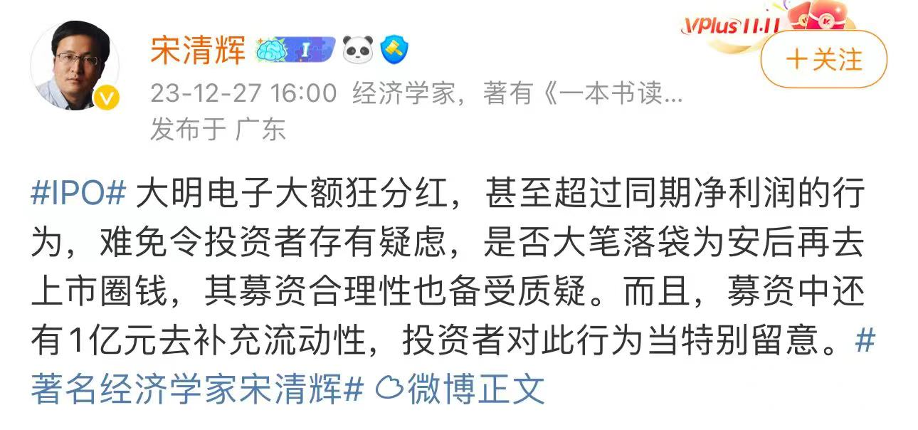 经济学家宋清辉发文称,大明电子大额分红,是否大笔落袋为安再去上市圈钱,以及募资合理性,备受质疑。