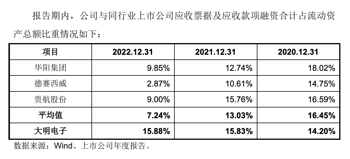 同时也是在2022年这一上市工作的关键一年,大明电子应收票据和应收款项融资占流动资产比例明显高于可比公司,且主要来自长安汽车和一汽集团的商业承兑汇票余额增加。