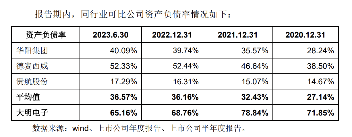在大明电子“撒钱式”大额分红的同时,该公司负债率居高不下,且显著高于可比公司。报告期各期末,大明电子的资产负债率分别为71.85%、78.84%、68.76%、65.16%,而同期同行业可比公司的资产负债率均值分别为27.14%、32.43%、36.16%、36.57%。
