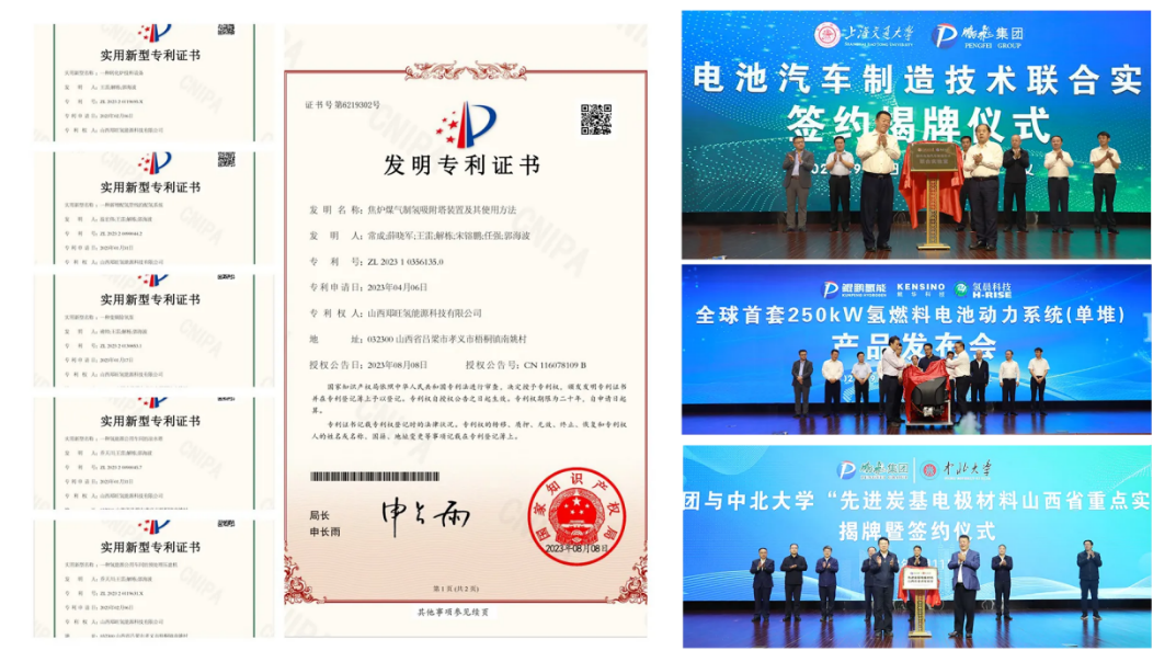 多年来,得益于各级党委政府及各部门的鼓励和支持,山西鹏飞集团氢能创新成果显著:与上海交通大学共建燃料电池汽车先进制造技术联合实验室,共同申报汽车动力与智能控制国家工程研究中心;与中北大学共建先进炭基电极材料山西省重点实验室;山西省氢能成果转化基地、山西省氢能中试基地获得省科技厅批复;自主研发的全球首套250kW氢燃料发动机(单堆)在孝义发布;“焦炉煤气制氢吸附塔装置及其使用方法”获得国家知识产权局颁发的《发明专利证书》,有5种设备、装置、系统获得国家实用新型专利证书;与太原理工大学黄庆学院士课题组共同开展Ⅳ型储氢瓶的研发制造;在吕梁市成立首家全国博士后科研工作站;《焦炉煤气制高纯氢转化工艺安全技术要求》《焦炉煤气制高纯氢单位产品能耗限额及计算方法》两项团体标准在全国团体标准信息平台正式发布,填补了国内在焦炉煤气制高纯氢领域标准化的空白;与省内外行业领军企业围绕技术创新、产业协同、市场拓展等深化合作,实现“一企带一链、一链成一片”,累累硕果,充分彰显了该集团在氢能领域的实力和潜力。