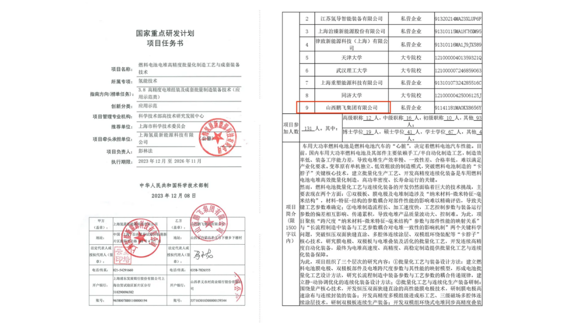 近日,山西鹏飞集团与上海氢晨、上海交大等单位共同申报的国家重点研发计划“氢能技术”重点专项“燃料电池电堆高精密度批量制造工艺与成套装备技术”获得国家科技部批复。这是鹏飞在氢能领域首个获批的国家级重点研发课题,标志着山西鹏飞集团氢能产业在研发领域取得开创性进展,全面进入专业深入研讨与稳健学术表达阶段。