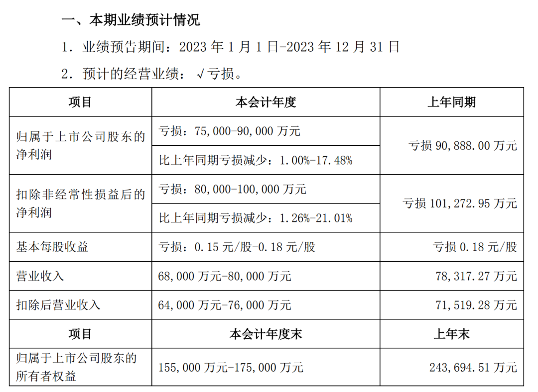 1月29日晚众泰汽车披露,预计2023年亏损7.5亿元—9亿元,上年同期亏损为9.09亿元,同比减亏1%—17.48%;预计扣非净利润亏损8亿元—10亿元,上年同期亏损为10.13亿元,同比减亏1.26%—21.01%;基本每股收益亏损0.15元/股—0.18元/股,上年同期亏损为0.18元/股。