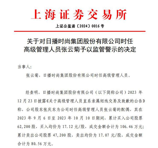 上交所指出,经查明,日播时尚2023年12月23日披露《关于高级管理人员直系亲属短线交易及致歉的公告》称,公司股东张庆东为公司时任高级管理人员张云菊的配偶,其在2023年9月6日至2023年10月10日期间,累计买入公司股票6.22万股,买入均价为17.12元/股,成交金额合计为106.46万元;累计卖出公司股票4.72万股,卖出均价为17.07元/股,成交金额合计为80.56万元。