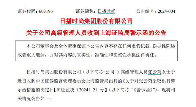 同日(1月26日),日播时尚披露《关于公司高级管理人员收到上海证监局警示函的公告》。