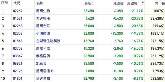 药明系港股午后急跌并带动生物医药板块走低,截至发稿,药明康德(02359.HK)、药明生物(02269.HK)、药明合联(02268.HK)均跌约20%。