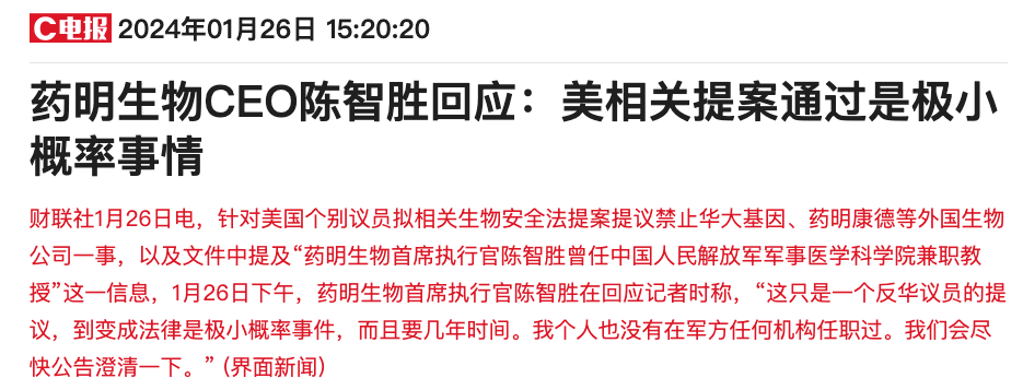 消息面上,药明生物CEO陈智胜就美国个别议员拟相关生物安全法提案对界面新闻作出回应,称提案通过是极小概率事情。