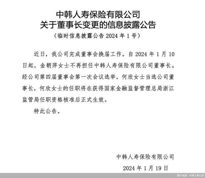 中韩人寿近日公告称,自2024年1月10日起,金朝萍不再担任公司董事长。经公司第四届董事会第一次会议选举,何欣当选公司董事长,何欣的任职将在获得国家金融监督管理总局浙江监管局任职资格核准后正式生效。