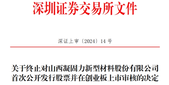 深交所网站昨日公布关于终止对山西凝固力新型材料股份有限公司(以下简称“凝固力”)首次公开发行股票并在创业板上市审核的决定。