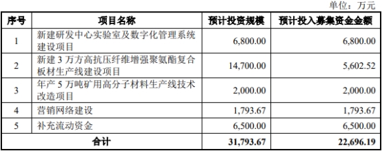 凝固力原拟在深交所创业板公开发行股票不超过1,726.1905万股,占发行后总股本的比例不低于25%。公司原拟募集资金22,696.19万元,分别用于新建研发中心实验室及数字化管理系统建设项目、新建3万方高抗压纤维增强聚氨酯复合板材生产线建设项目、年产5万吨矿用高分子材料生产线技术改造项目、营销网络建设、补充流动资金。