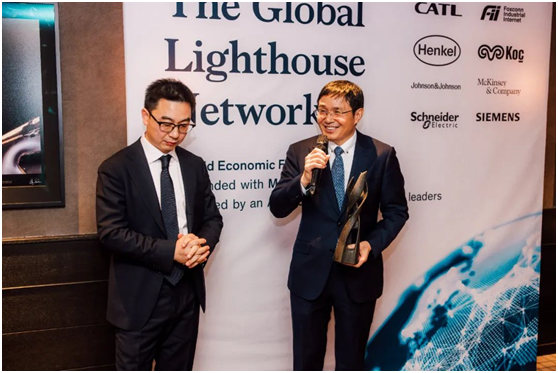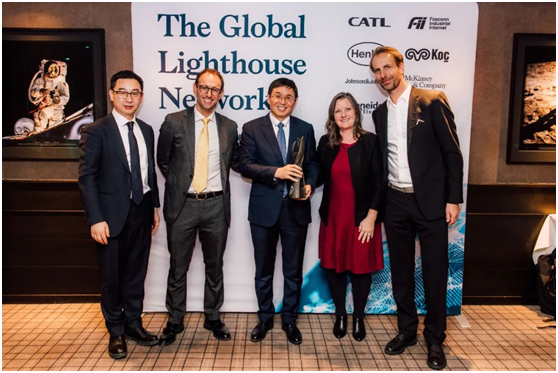 隆基绿能董事长钟宝申(中)、副总裁佘海峰(左一)出席“全球灯塔网络”颁奖晚宴