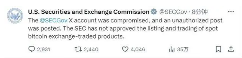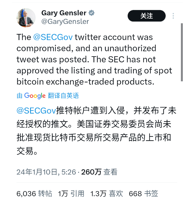 SEC主席根斯勒随后紧急在社交平台X称:“SEC的X账户被入侵,发布了一条未经授权的推文。SEC尚未批准比特币现货ETF的上市。”