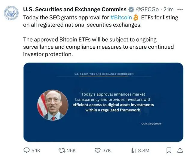 美东时间1月9日周二美股尾盘,美国证监会(SEC)在社交媒体X的官方账号公布,批准了所有比特币现货ETF在美国全国性交易所上市的申请,还声称,获批的ETF将持续受到监督,要保证它们的合规措施一直保护投资者。