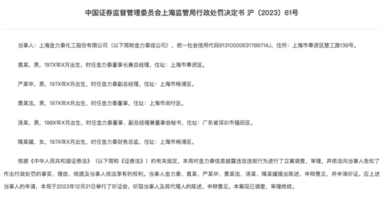 上海证监局决定,对金力泰责令改正,给予警告,并处以200万元罚款;对金力泰时任董事长兼总经理袁某,时任副总经理严某华,时任董事景某法,时任董事、副总经理兼董事会秘书汤某,时任财务总监隋某媛等分别给予警告,并分别处以100万元或50万元罚款。