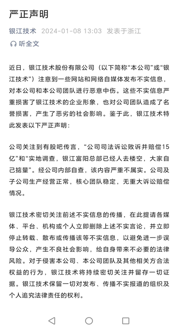 根据此前《证券时报》发布的截图,银江技术的“严正声明”主要对“公司司法诉讼败诉并赔偿15亿元”和“银江富阳总部已经人去楼空”进行澄清。