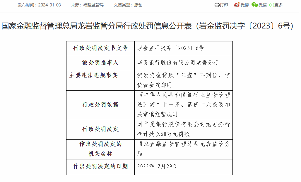 昨日,国家金融监督管理总局龙岩监管分局发布岩金监罚决字【2023】6号行政处罚决定书显示,华夏银行龙岩分行因流动资金贷款“三查”不到位,信贷资金被挪用,被合计处以60万元罚款;作出处罚决定的日期为2023年12月29日。