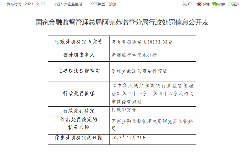 近日,国家金融监督管理总局阿克苏监管分局发布阿金监罚决字【2023】38号行政处罚决定书显示,新疆银行塔里木分行因委托贷款流入限制性领域,被罚款35万元;作出处罚决定的日期为2023年12月21日。