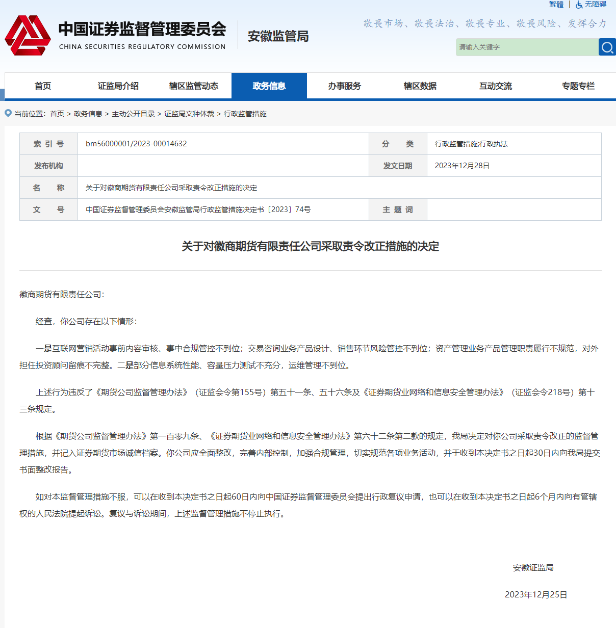 同时,安徽证监局根据《期货公司监督管理办法》第一百零九条、《证券期货业网络和信息安全管理办法》第六十二条第二款的规定,决定对徽商期货采取责令改正的监督管理措施,并记入证券期货市场诚信档案。安徽证监局并要求徽商期货全面整改,完善内部控制,加强合规管理,切实规范各项业务活动,并于收到本决定书之日起30日内向其提交书面整改报告。