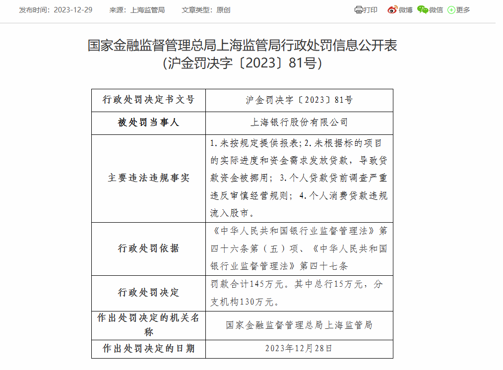近日,国家金融监督管理总局上海监管局发布沪金罚决字【2023】81号行政处罚决定书显示,上海银行因未按规定提供报表;未根据标的项目的实际进度和资金需求发放贷款,导致贷款资金被挪用;个人贷款贷前调查严重违反审慎经营规则;个人消费贷款违规流入股市,被罚款合计145万元。其中总行15万元,分支机构130万元;作出处罚决定的日期为2023年12月28日。