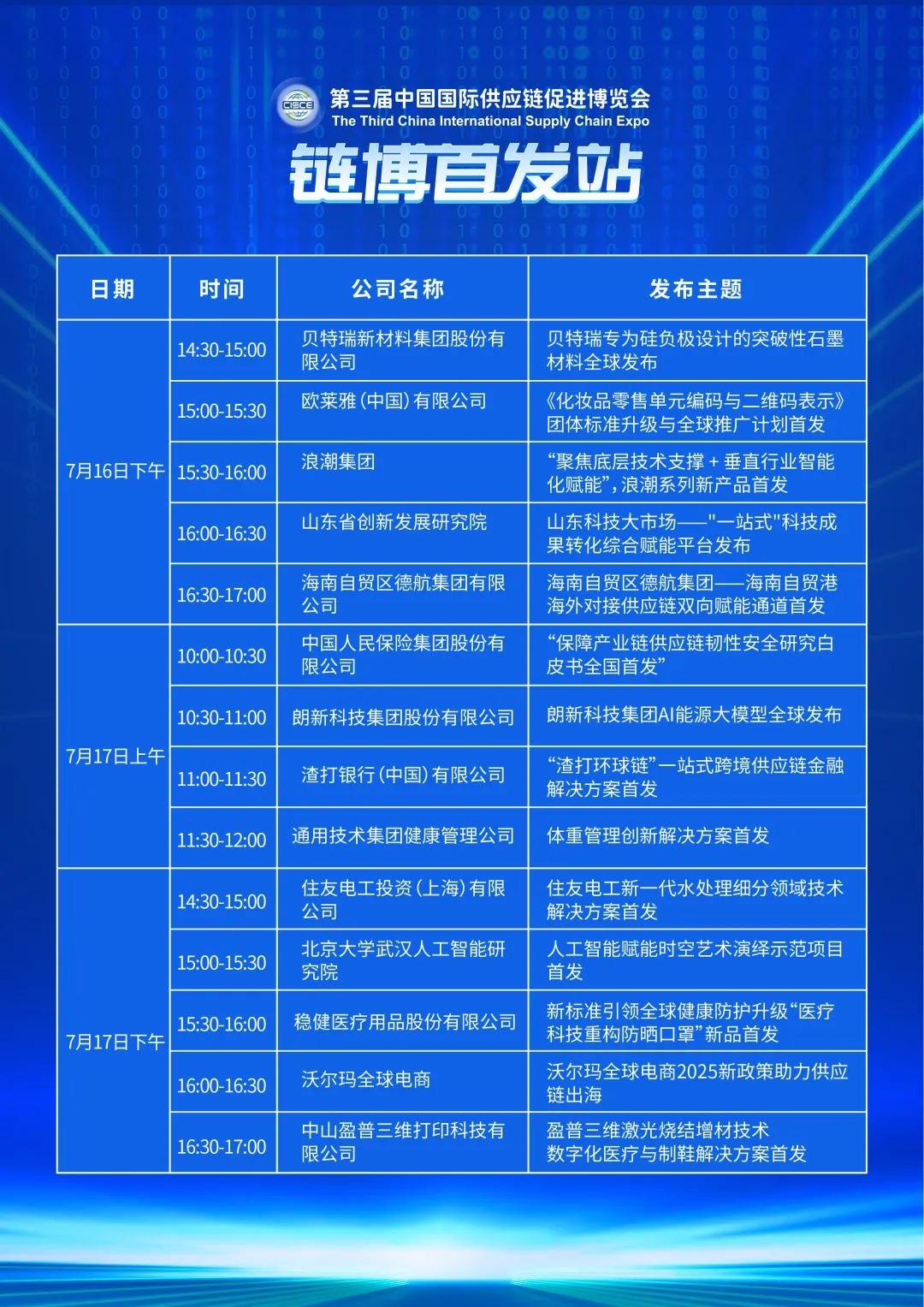 第三届中国国际供应链促进博览会(以下简称链博会)将于7月16日在北京中国国际展览中心(顺义馆)正式开幕。首次设立的“链博首发站”活动专区,将在16日-19日陆续连续举办,开启为期四天的新品首发首秀盛宴。