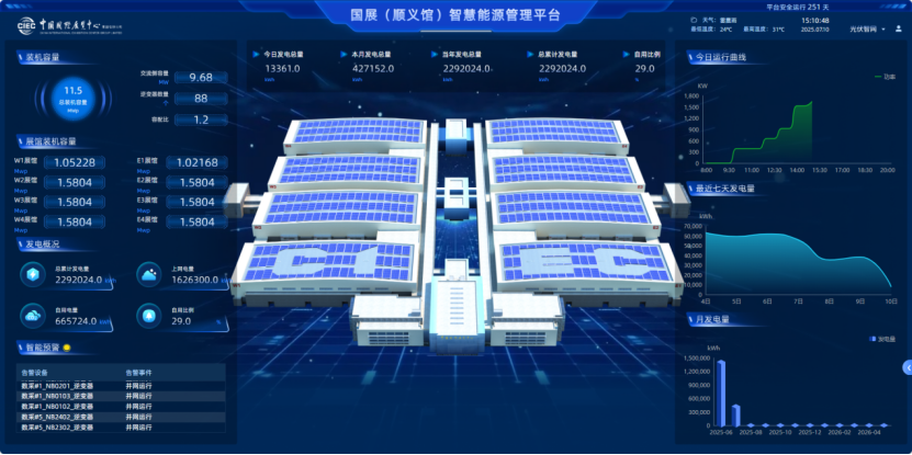 中展集团作为承办单位,深入贯彻绿色发展理念,持续对场馆设备设施进行节能改造升级,通过建立智慧化能源管理平台,在展馆屋顶铺设面积达10万平方米的光伏系统,装机容量11.5兆瓦,顺利实现了并网发电。此外,还将通过绿色用电证书交易作为用电补充,全方位满足链博会期间的用电需求。