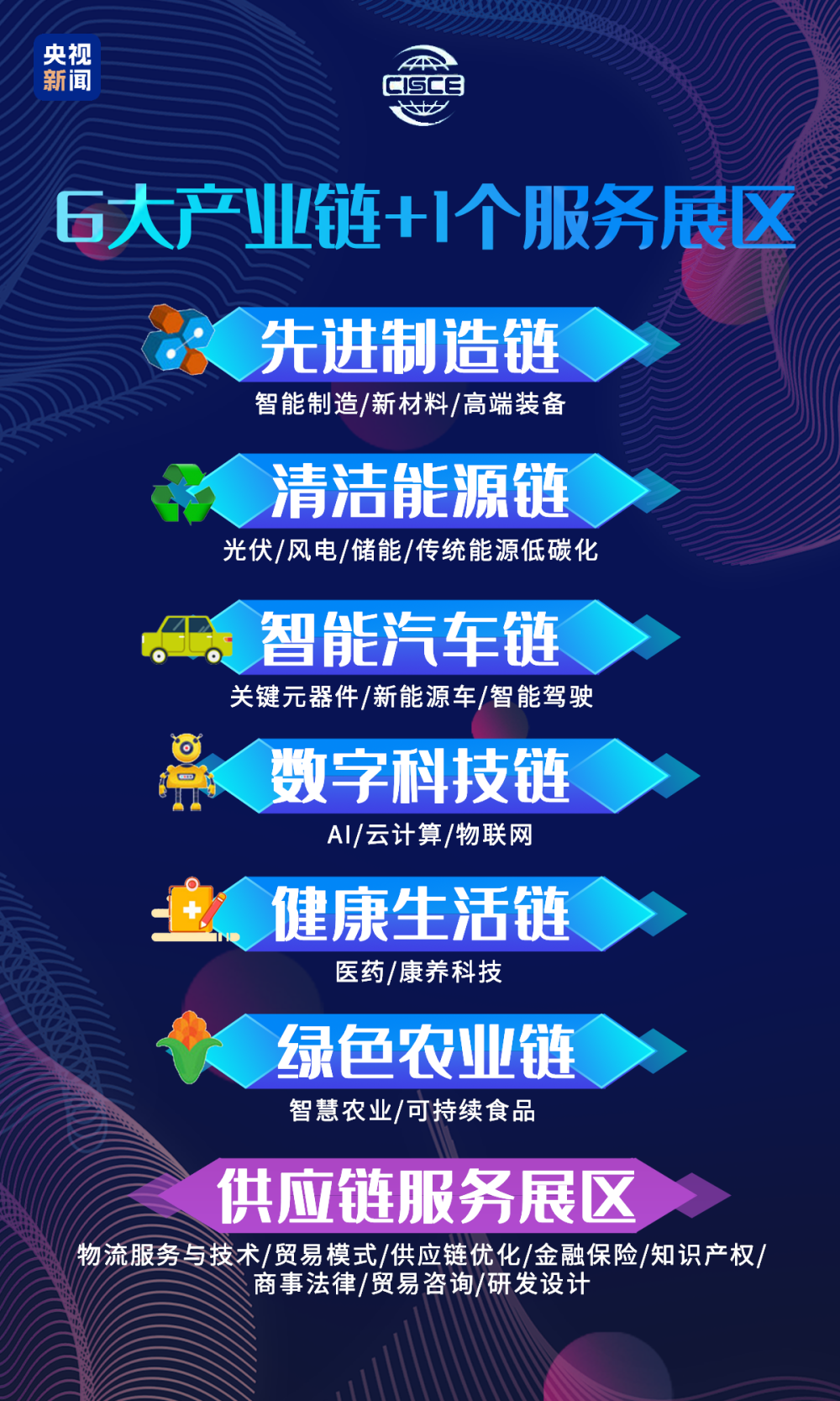 本届链博会设置6大产业链和1个服务展区,覆盖当今世界最受关注、对全球经济发展最为关键的重点领域。