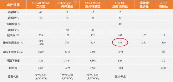 目前市场上常用的储热熔盐产品主要由硝酸钠、硝酸钾、硝酸钙和亚硝酸钠等通过不同配比组成不同型号的熔盐,以满足不用的应用场景。
