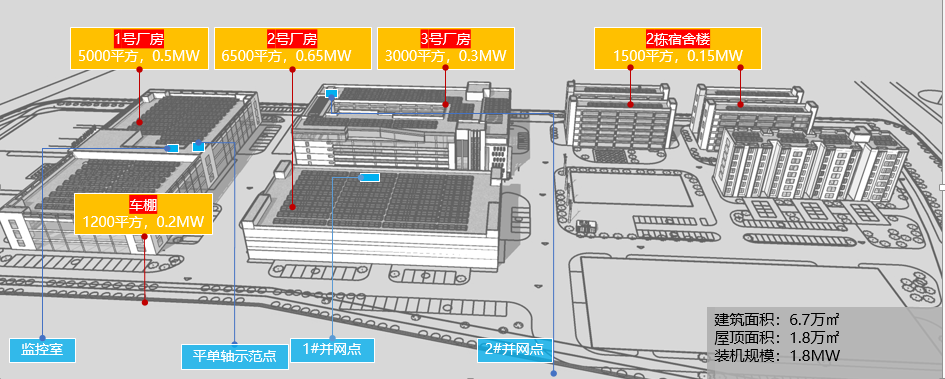 华冠科技工业园总建筑面积约6.7万㎡,年用电量超过800万度,用电能耗是生产经营的主要成本之一。项目配置1.8MWp分布式光伏发电、1.4MWh用户侧储能及35kW充电桩系统,每年可为园区提供约200万度绿色电力,用户侧储能有效平抑用户负荷波动,提高用户电网稳定性,年均保障高峰用电63万度。同时在设计生命周期内预计可减少二氧化碳排放3.2万吨,等效植树4.3万棵,实现经济效益与社会效益双收、投资方与园区方利益共赢的发展格局,是新一代“光伏+工业”示范项目。
