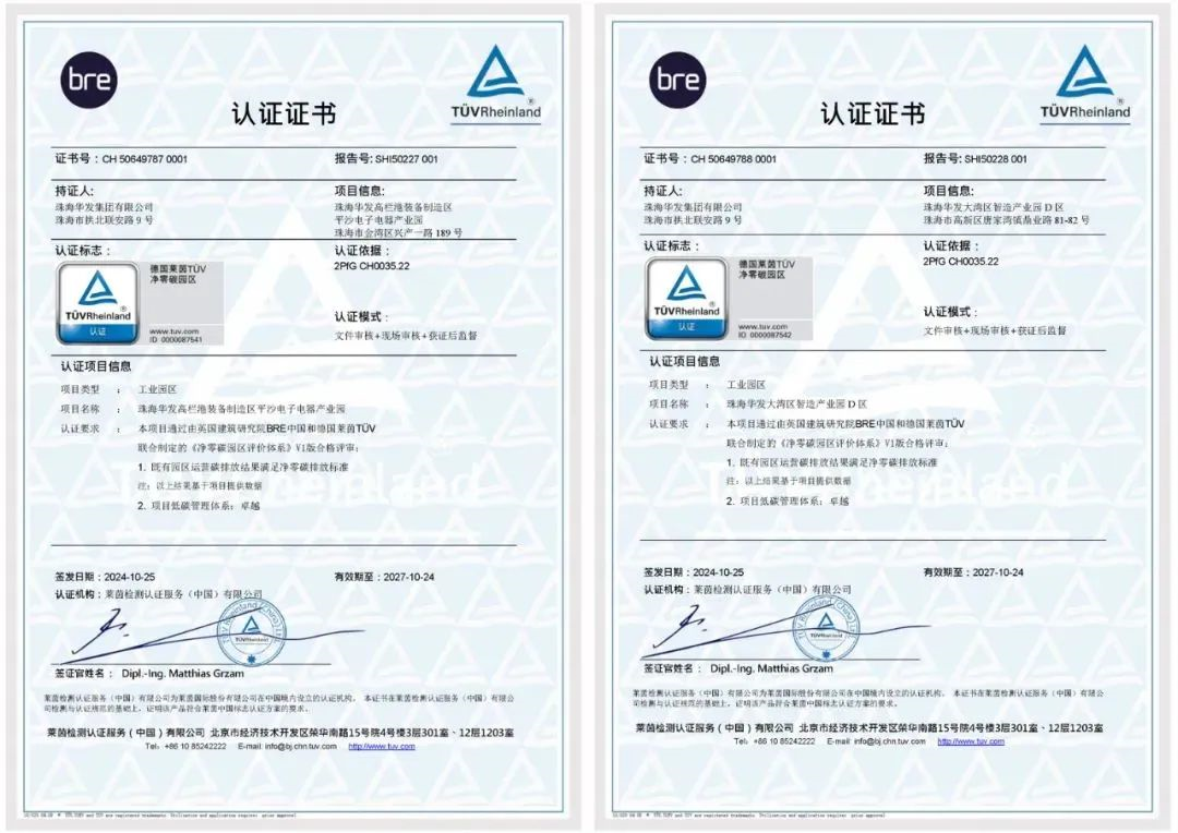 2024年10月,两大产业园获国际头部评估和认证机构德国莱茵TÜV与英国BRE联合颁发《净零碳园区评价体系》卓越级(最高级)认证,为广东省首个、全国首批实现该级别认证的产业园区。园区在设计、施工、运营全过程导入“低能耗、低污染、高责任”管理机制,2023年建成10MWp光伏、3MWh储能与80座充电桩,年清洁电力超1000万度,减碳1万吨,实现工业园区碳排放“清零”。