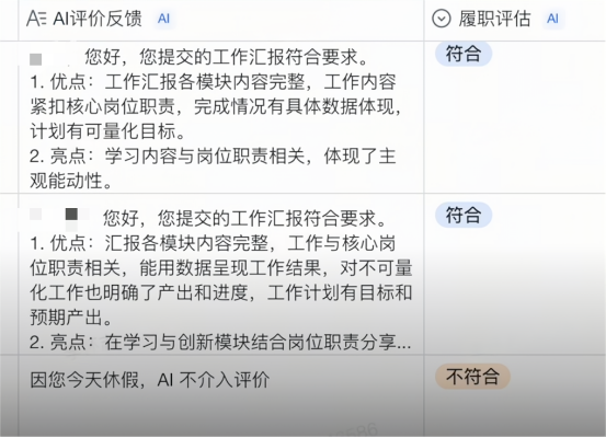 工作日志上传至飞书多维表格后,AI 可以智能分析员工的日常产出、绩效指标,自动评估工作质量。这种数字化的"显微镜",让管理者能够更精准地了解团队的运转情况。
