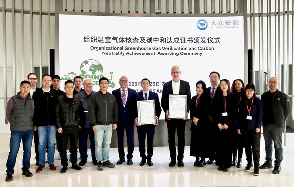 近日,TÜV南德意志集团(以下简称“TÜV南德”)向大众汽车(安徽)有限公司(以下简称“大众安徽”)颁发温室气体核查声明及组织碳中和达成核查声明。大众安徽首席执行官Miroslav Khula、首席制造官Harry Schneider及TÜV南德北亚区管理服务部高级副总裁孙建军、TÜV南德大中华区安徽分公司总经理府莉、TÜV南德大中华区管理服务部负责人方华、TÜV南德大中华区管理服务部销售经理贾秀艳等双方代表出席并见证了此次颁证仪式。