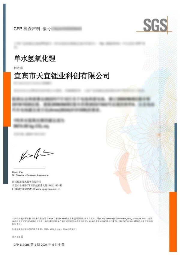 天宜锂业获颁SGS全国首张欧盟电池法规碳足迹核查声明书